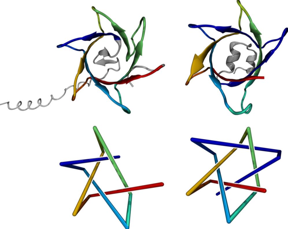 此外,同源物之间的蛋白质拓扑结构通常相似,这意味着在进化中密切相关的蛋白质中往往会保留打结的折叠。由于这些原因,并且由于天然蛋白质之间打结的罕见性,在预测蛋白质结构的庞大新数据库中可能存在打结拓扑结构引起了人们的浓厚兴趣。