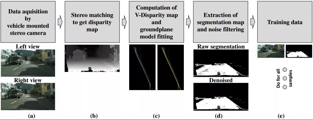 第三篇文章提出了一种基于深度神经网络(DNN),针对可驾驶区域分割任务的训练数据生成方法。作者提出了一种自动的标注流程,利用确定性立体的地面检测方法,创建了适合神经网络训练的大型数据集,为道路分割任务作出了贡献。