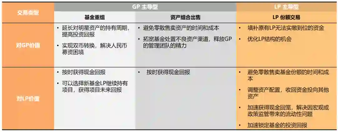 已为中国大部分GP所熟悉的是LP主导型交易模式,更多是LP出于流动性考虑而产生的LP之间的份额转让,因其难为VC/PE基金的管理规模带来增量,所以GP一般没有驱动力积极配合尽调、工商变更等S交易环节。