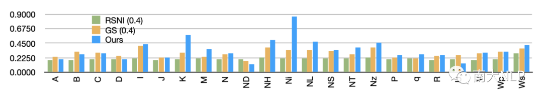 由于我们的方法是基于对受害系统的不断交互反馈从而习得的攻击偏好,因此我们在不依赖错误特征建模的前提下能通过这些偏好观察系统的弱点。我们统计了攻击涉及的POS,对比对照组RSNI(较随机均匀)和基线GS(有一定程度偏好)可以明显看出系统弱点(图6),比如各类命名实体(N)、数字(M)、后缀(K)等。