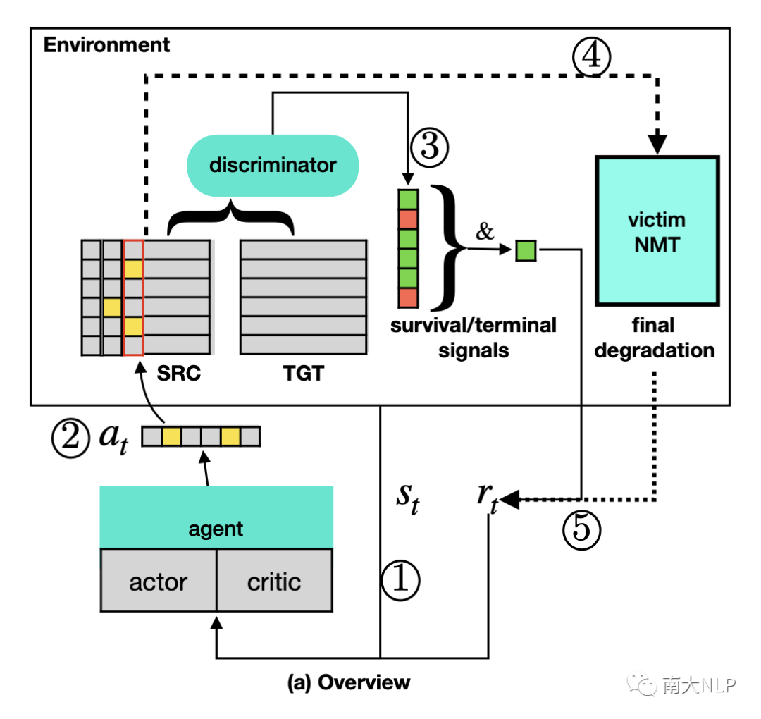 环境中的discriminator对修改的句对评估survive/terminal信号,并产生单步反馈。