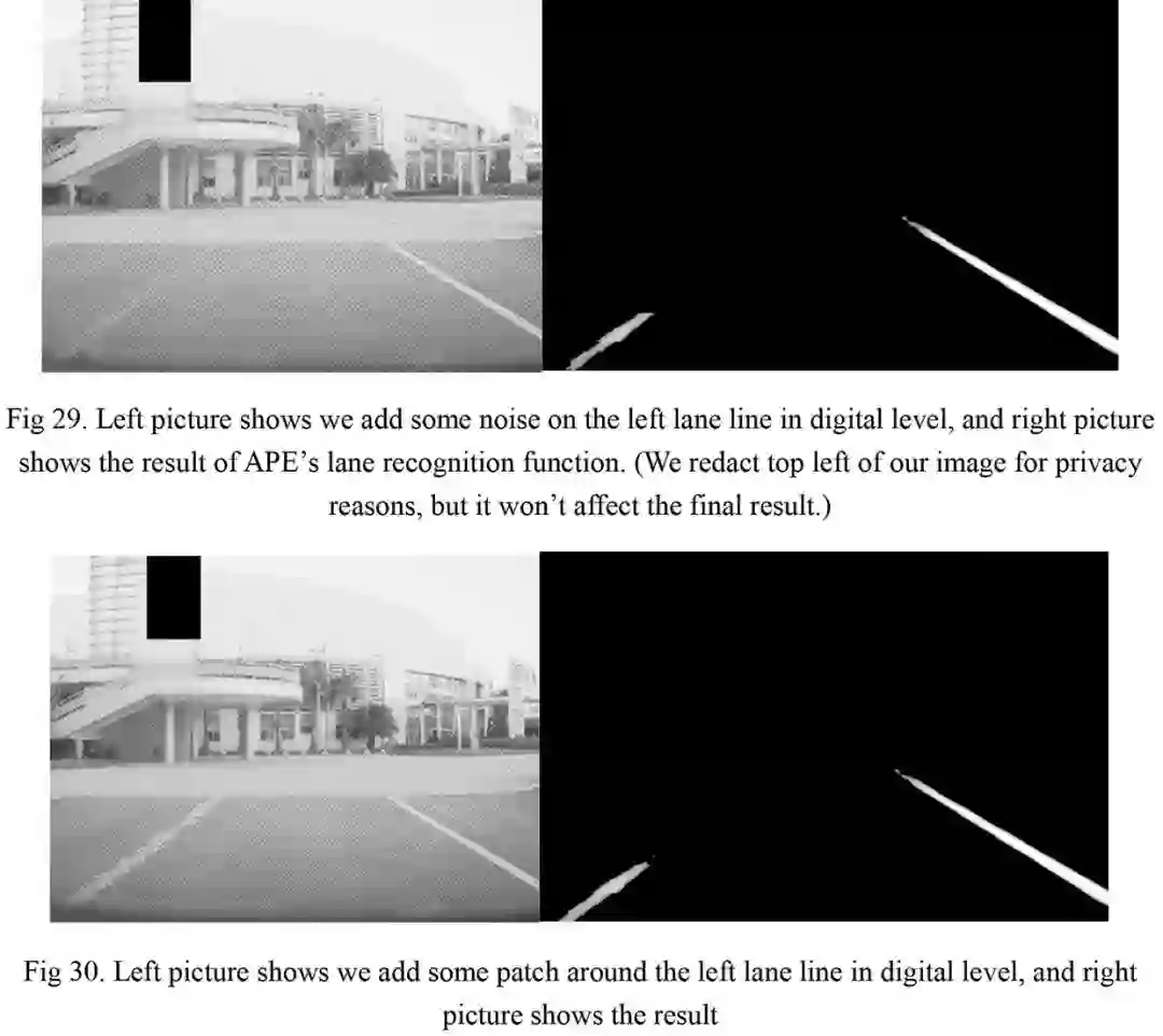 Autopilot 模块的车道识别功能有良好的鲁棒性,如果想通过在现实世界中布置一些不显眼的标志来使行驶中的特斯拉汽车车道识别功能失灵,很难。我们怀疑这是因为特斯拉在其训练集中添加了很多不正常的车道,比如破损或者被遮挡的车道,以应对物理世界的复杂性。这导致其自动驾驶系统在正常的外部环境(无强光、雨雪、沙尘暴等干扰)中表现良好。