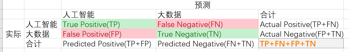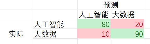 先看人工智能专业,实际有100个同学,然后分类器分类之后得到的结果是80名同学都归到了左边,表示分类正确,有20名同学分到右边,表示分类错误。同理大数据专业,有10名同学分类到左边,表示分类错误,有90名同学归到右边,表示分类正确。