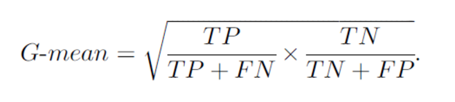 接下来的问题是对于不平衡数据来说,对于上面我们讨论的问题说的是人工智能专业和大数据专业都是100名同学,这种分类问题,是常见的二分类问题,如果我们的正类有199个,负类样本有1,然后做分类的时候,上面讲的那些公式基本都废了。。。是的,不信大家可以去试试计算一下。然后最后我要介绍另外一个公式叫G-means,G-means是一种常用的评价不平衡问题的度量准则,公式如下:
