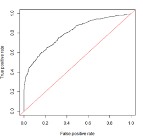 下面这个图就是ROC曲线,红色线表示AUC=0.5的时候ROC曲线的样子。然后这里要提一下基尼系数,因为Gini=2*AUC-1,从图中看,Gini系数指ROC曲线与红色线围成的面积占AUC的比例。基尼系数本来是经济学中的一个概念,基尼系数为0,表示没有贫富差距,基尼系数越大,表示贫富差距越大。