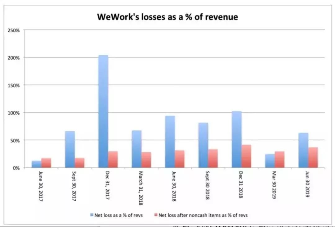 此外,WeWork的损失在其收入中所占的百分比,也没有随时间推移而下降。请看下图: