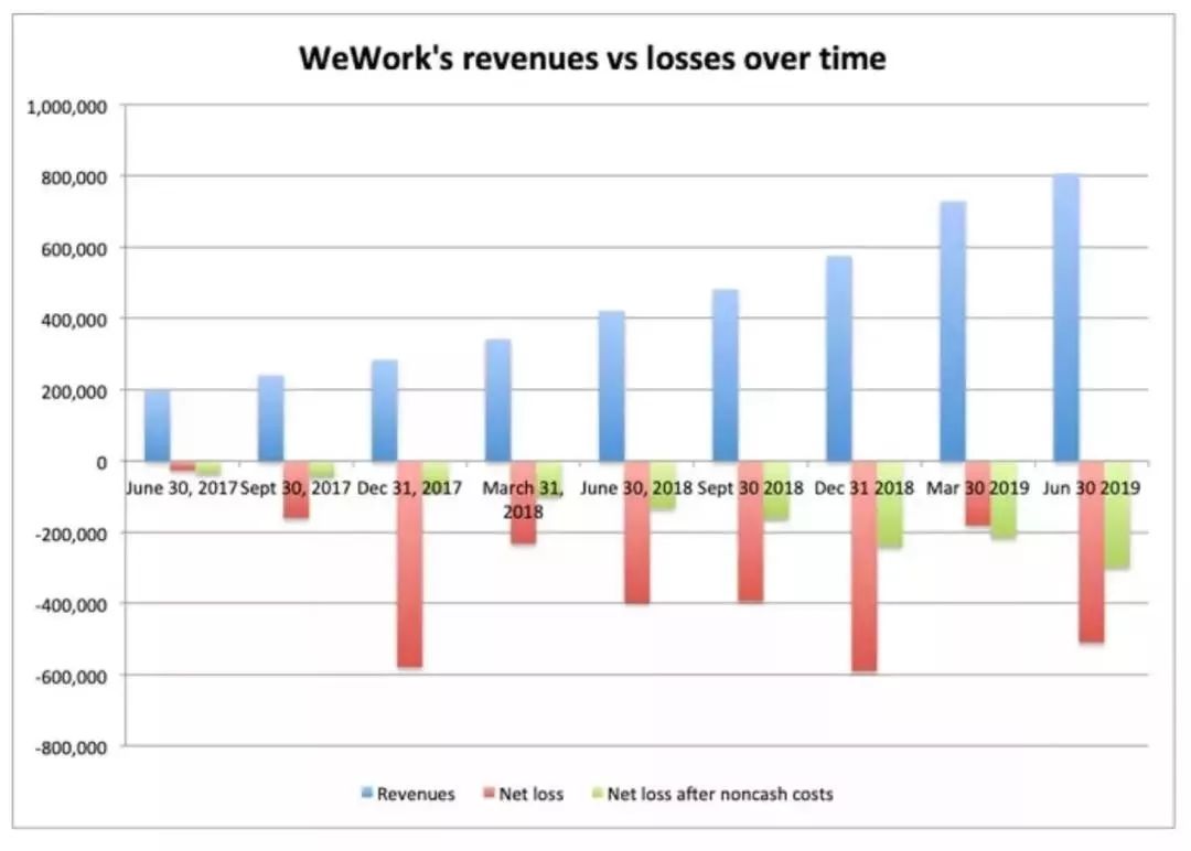 前述这种增长,需要大量钱。WeWork的亏损也相当惊人。