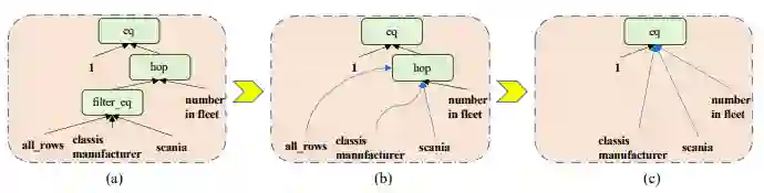 此外,观察到,逻辑表达式中有些节点是“工具”节点,其被设计用来在表格上执行,但其本身与输入的自然语言语句之间是语义不相关的(例如, “filter_eq”, “hop”等等),为了更好的利用证据信息,我们设计了一个动态剪枝的方法来自动移除这些节点,如图4所示。具体来说,我们为图中的每个节点打分,然后根据分数以概率θ来移除分数最低的节点,分数的计算方法如下: