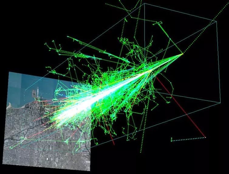 ○ 模拟:在距离表面20公里的上空,当质子击中大气层产生的宇宙射线流。| 图片来源:Wikepedia