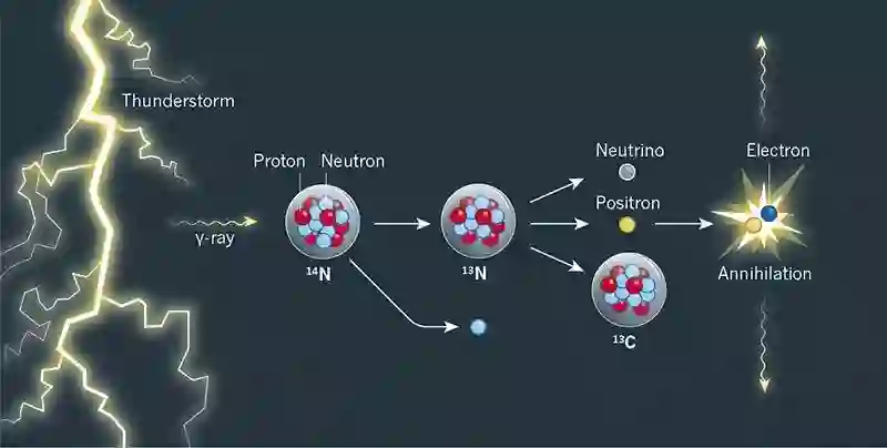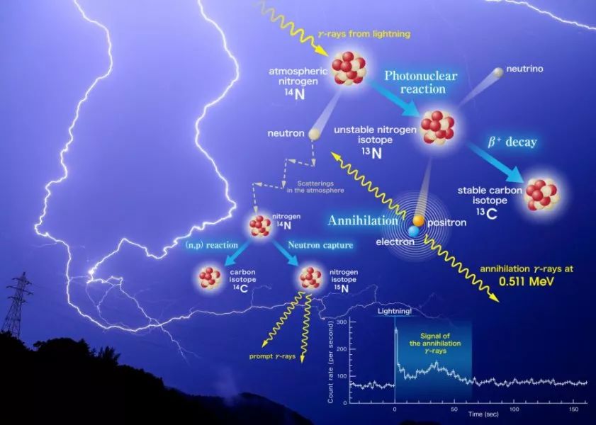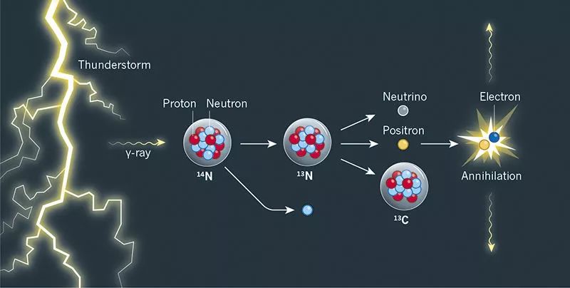 ○ 由雷暴引发的核反应。新的论文为证明雷暴可以诱发大气中的核反应提供了确凿的证据。例如,研究人员发现,雷暴能产生高能伽马射线,将中子从氮-14的原子核中击出,产生不稳定的氮-13同位素。同位素会衰变成一个中微子、一个正电子和一个稳定的碳-13原子核。最后,正电子与一个大气分子的电子湮灭,产生一对伽马射线,每一个射线都有一个特征能量(即0.511兆电子伏特)。| 图片来源:[1]