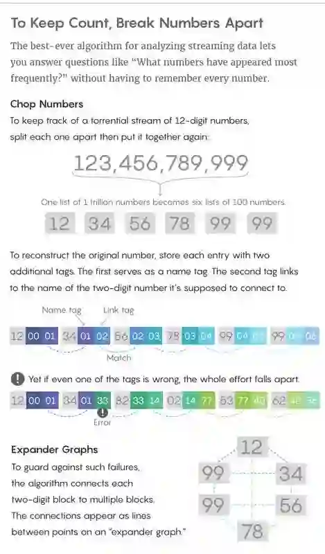 在接下来的 30 多年中,Cormode 和其他计算机科学家改进了 Gries 和 Misra 的算法。例如,一些新算法能够检测趋势词条,而另一些则能够对词条频繁出现的含义进行更细致的定义。所有这些算法都做出了权衡,比如牺牲速度来提高准确性或者加大内存消耗来增强可靠性。