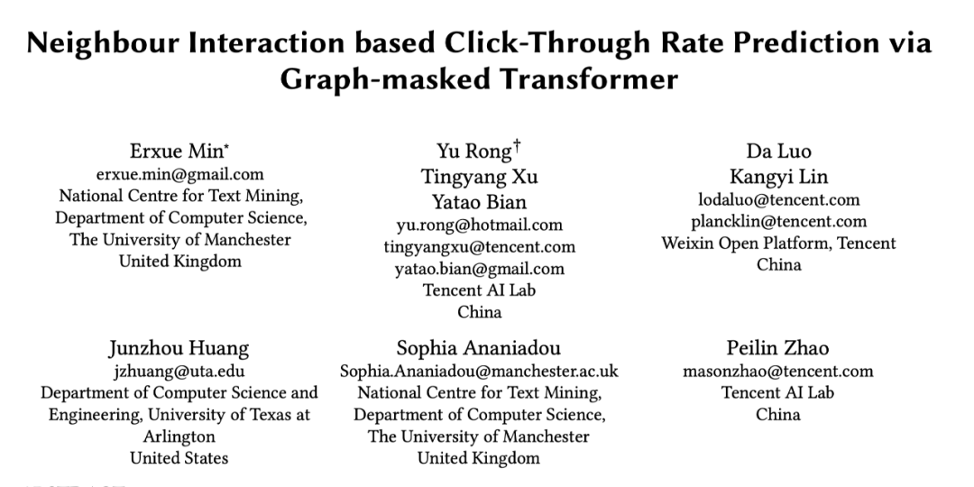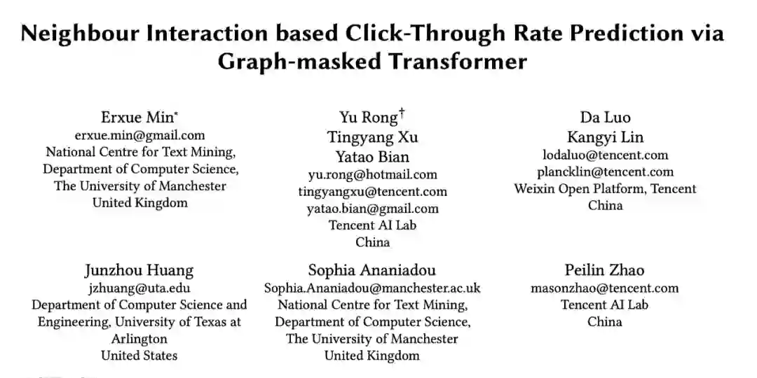 本文介绍的是腾讯 AI Lab 和微信公众平台共同研发的一种最新的在异质图上基于邻域交互的点击预测新模型。论文题目为《Neighbour Interaction based Click-Through Rate Prediction via Graph-masked Transformer》,论文已被 SIGIR2022 录用。并且在实际线上场景部署 A/B 测试中获得很好的效果。