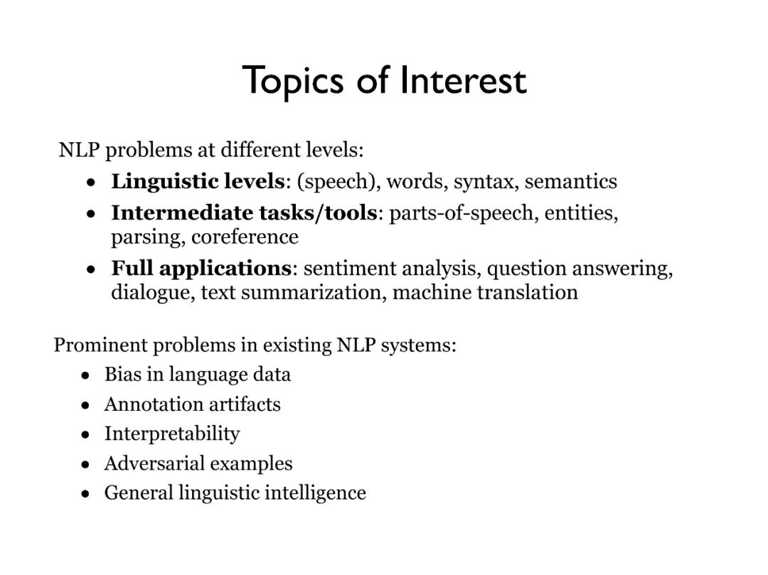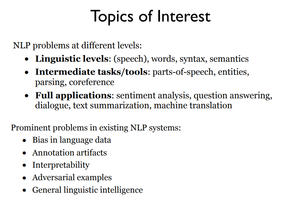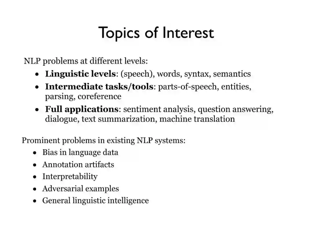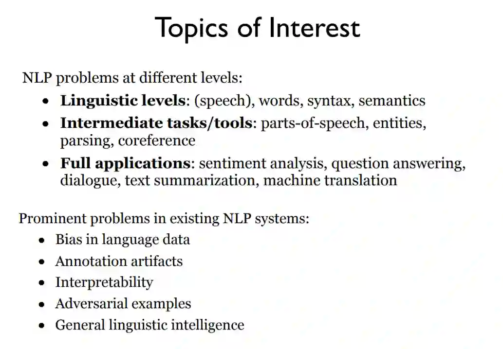 本课程旨在为您在自然语言处理方面的前沿研究做准备。我们将讨论在NLP的每个子领域中最有影响力的想法,最先进的技术和我们今天面临的主要问题。