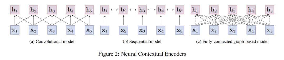大部分的神经上下文编码器可以分为三类:卷积模型、序列模型和基于图的模型。图2说明了这些模型的体系结构。