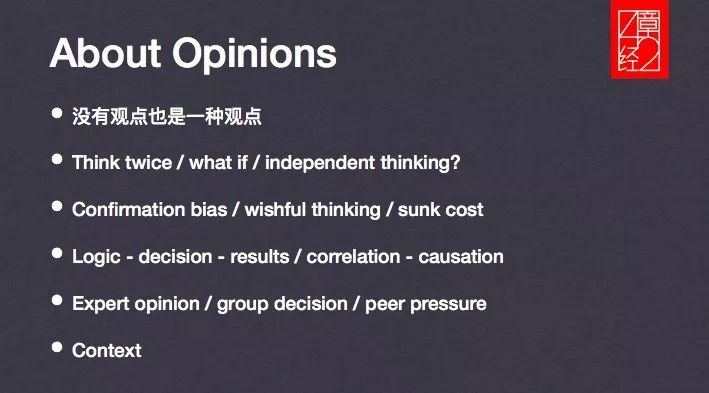 第一,不要怕没有观点,没观点也是一种观点。至少美国有些 VC 就是这样,直接说“我不去”,而有的投资人是先研究,研究好了再投;有的投资人是直接开门迎客,听人讲。