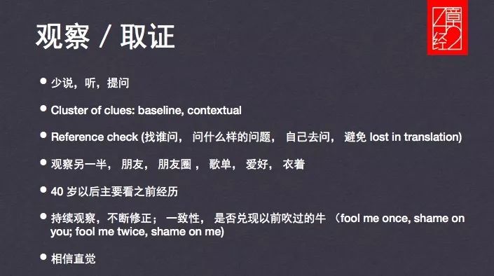第二条则是,你不能只找一个线索,而应该把很多线索串起来,要学会“联系上下文”。比如,一些微表情的书会教给你一个人把手臂拢起来是什么意思、翘二郎腿是什么意思等等,我觉得都有道理,但如果你不能较为全面地了解一个人,仅凭这个还是会做出错误的判断。