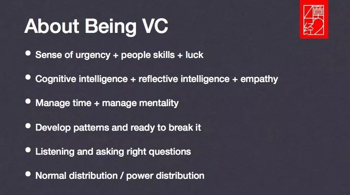 另外,VC 需要 people skill 。因为你在找项目的过程中需要和别人建立信任,尤其是在如今竞争如此激烈的情况下。VC 在别的技能上可以弱,但是 people skill 必须 OK 。