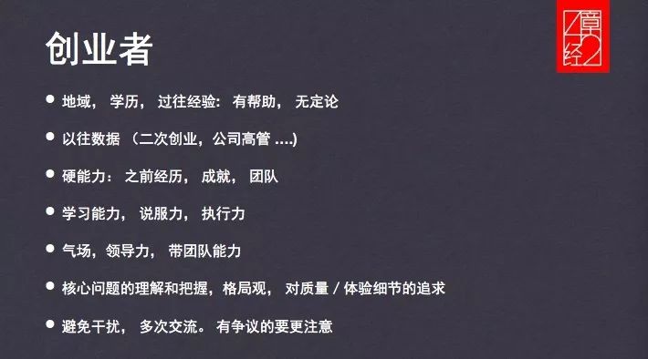 地域、学历、经验都对了解创业者有帮助,每次面见创业者,基本上都会问这些问题,以及为什么要做这么一个选择,但是这方面的数据不足够去做最终的判断。
