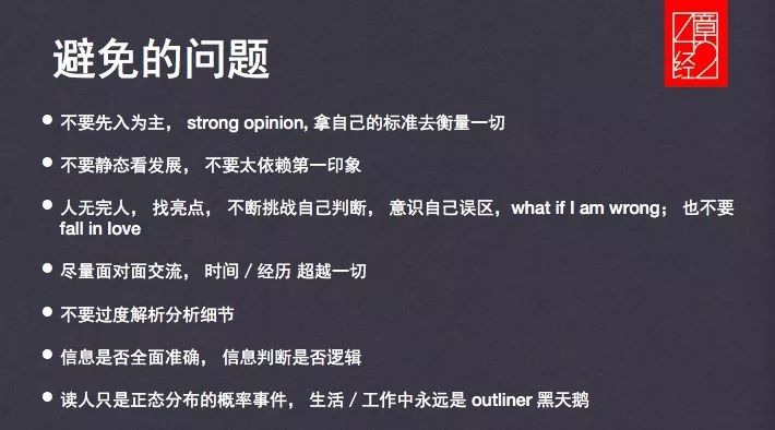 比如,不要静态看发展,不要太依赖第一印象。投资也好,见人也好,都很容易在三五分钟之内形成了一个特别强的印象。但是,你一定要不断反观这个印象,要通过不断地交流,来对比和修正对他人的第一印象。