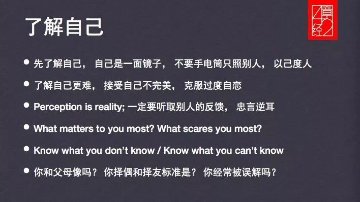 我觉得以上几条内容都是“了解自己”的途径,但这是一个非常艰难的过程。我今年四十多岁了,我对自己认识的过程还在不断变化,包括从他人的反馈中才逐渐明白和了解自己。