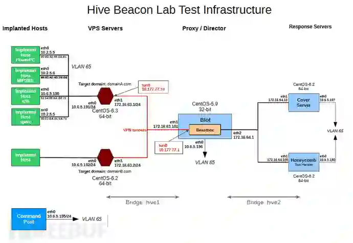 HIVE的攻击原理为通过军工商诺斯·格鲁曼(Northrop Grumman)研发的代理架构BLOT和一个名为Switchblade的中间架构,在入侵目标与CIA远程控制端进行隐蔽通信和管理控制。其中,所有的C&C通信又通过BLOT架构配置的Apache服务器和域名中转脚本进行回连控制,而且为了增强隐蔽性,所有HIVE使用的IP地址都可以在VPS系统内完成重定向动作。