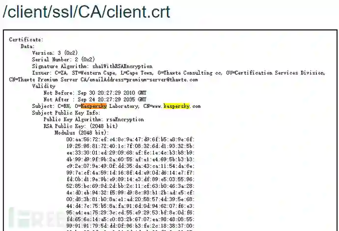 有意思的是,在Vault8曝光的HIVE源代码中,在目录/client/ssl/CA/下存在这样一个伪装成卡巴斯基公司的客户端认证证书client.crt,该证书的签发机构为Thawte Premium Server CA数字证书公司。