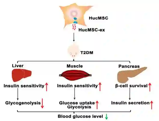 因此,研究人员假设hucMSC-ex也可以缓解在hucMSC中观察到的T2DM中的高血糖症。在这项研究中,利用hucMSC-ex来减轻HFD和STZ诱导的T2DM大鼠模型具有可行性和有效性。结果表明静脉输注hucMSC-ex可以通过增强外周器官胰岛素敏感性和减轻胰岛破坏来降低T2DM大鼠的血糖水平。HucMSC-ex可以通过促进肌肉中GLUT4的表达和膜转运以及依赖于胰岛素的肝糖原储存来恢复T2DM的葡萄糖稳态。 HucMSC通过抑制STZ诱导的β细胞凋亡来缓解T2DM中的胰岛素分泌功能障碍。综上所述,HucMSC-ex在T2DM大鼠模型中表现出理想的缓解糖尿病的能力。