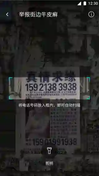 ①在腾讯手机管家安卓版的“骚扰拦截”中,点击“举报街边牛皮癣”,则调起系统相机进行扫描,利用OCR截取特征进行识别。由于牛皮癣广告的乱张贴特性,小广告的各种变形扭曲可能导致识别出错,因此我们提供了直接图片举报入口,后台对这些原始数据持续进行分析学习,提升识别率。