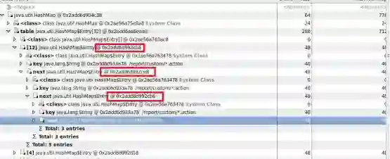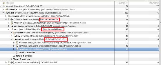 堆栈现场如图 12 所示,根据 MAT 对 dump 数据的分析,发现最多的内存对象为 byte[] 和 java.util.HashMap $Entry,且 java.util.HashMap $Entry 对象存在循环引用。初步定位在该 HashMap 的 put 过程中有可能出现了死循环问题(图中 java.util.HashMap $Entry 0x2add6d992cb8 和 0x2add6d992ce8 的 next 引用形成循环)。