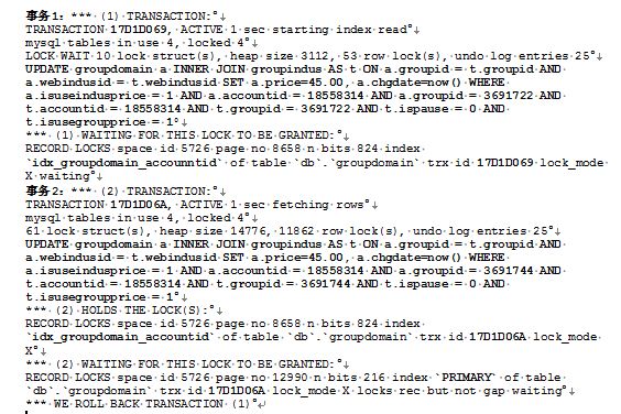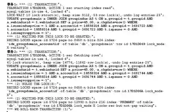 从上面发生死锁的问题可以看到,事务 1 和事务 2 均选择了 idx_groupdomain_accountid 的单列索引。根据 Mysql innodb 引擎加锁的特点,在一次事务中只会选择一个索引使用,而且如果一旦使用二级索引进行加锁后,会尝试将主键索引进行加锁。进一步分析可知事务 1 在请求事务 2 持有的`idx_groupdomain_accountid`二级索引加锁(加锁范围“space id 5726 page no 8658 n bits 824 index”),但是事务 2 已获得该二级索引 (“space id 5726 page no 8658 n bits 824 index”) 上所加的锁,在等待请求锁定主键索引 PRIMARY 索引上的锁。由于事务 2 等待执行时间过长或长时间不释放锁,导致事务 1 最终发生回滚。