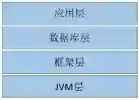 Java 应用性能的瓶颈点非常多,比如磁盘、内存、网络 I/O 等系统因素,Java 应用代码,JVM GC,数据库,缓存等。笔者根据个人经验,将 Java 性能优化分为 4 个层级:应用层、数据库层、框架层、JVM 层,如图 1 所示。