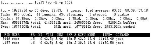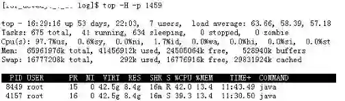 图 2 中 15 分钟负载已经高达 57.18,1 分钟负载是 63.66(系统为 16 核),说明系统出现负载问题,且存在进一步升高趋势,需要定位具体原因了。