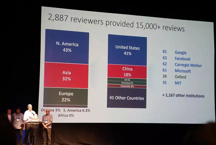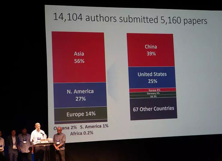 根据统计,大多数论文投稿来自大学;另一方面,大多数论文来自亚洲(如果按照国家来分的话,大约 39% 的论文来自中国作者们)。 所有论文一共有一万四千多位作者,这个数量甚至可以单独组成一个城市。