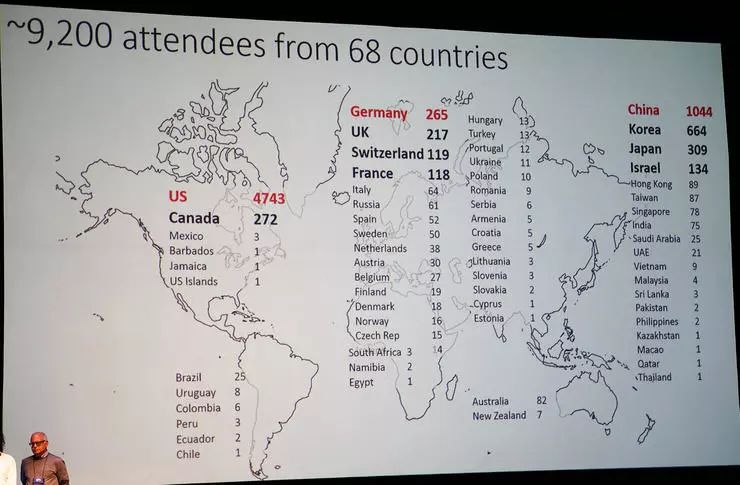 参会人数也许超出了所有人的预料,这张图在屏幕上显示出来后立刻引起了观众们的惊叹声。人数连年飞涨,仅正常注册参会、参加全部会议议程的就有 9227 人,这一数字还没有包括参展企业的相关人员。如果把会议工作人员也算上的话,一定超过一万人了。朱松纯也说道,好在有这个规模的会议场馆可以订。