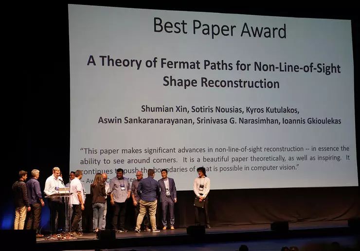 论文奖委员会的授奖理由:这篇论文作出重大进步的问题是非视线内的物体形状重建,换句话说就是能看到墙角后面的东西。这篇论文的理论部分非常优美,而且同样非常给人带来激励。它把计算机视觉所能解决的问题的边界继续向前推进了一步。