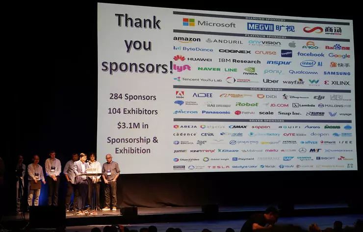 今年的 CVPR 有多达 284 个赞助商、104 个参展商,在屏幕上是密密麻麻的一片,在会议签到时发放的会议手册封底也可以看到这个名单几乎囊括了领域内所有耳熟能详的科技公司。在这些企业的支持下,CVPR 2019 共获得了三百一十万美金的资金支持。