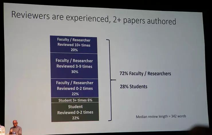 已经获得博士学位的学校教职人员、研究人员的比例为 72%,尚未获得学位的学生为 28%。对于有丰富学识的学者,现在有很多都到了企业任职。总的来说,这也是大家期待的「审稿人水平总体比投稿人水平更高」的体现。