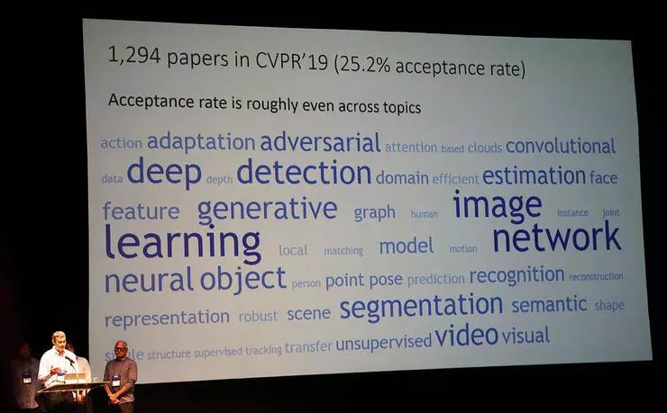 根据 CVPR 2019 论文提取的热门词汇如图,符合预期地反应了整个领域内研究人员们关注课题的分布。另外,不同主题论文的接受率差不多,这算是一个小的惊喜。