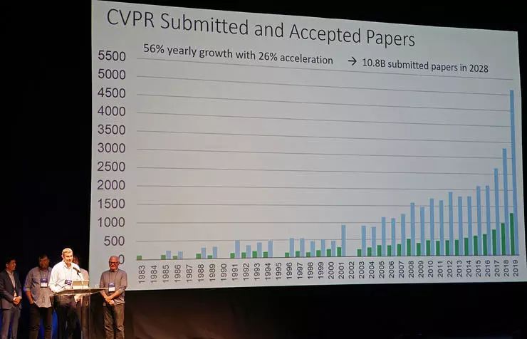 与前面朱松纯介绍的参会人数变化相符的是论文投稿数目的历年变化,Derek Hoiem 的解读是 CVPR 2019 的论文相比去年增加了 56%,增速也增加了 26%。然后就是 AI 相关领域的经典笑话时间:按照这个指数增长速度,只需要到 2028 年,CVPR 就可以收到 108 亿篇投稿,全地球平均每个人都至少有一篇论文投稿,其中包括了老人和小孩。全场哄笑。