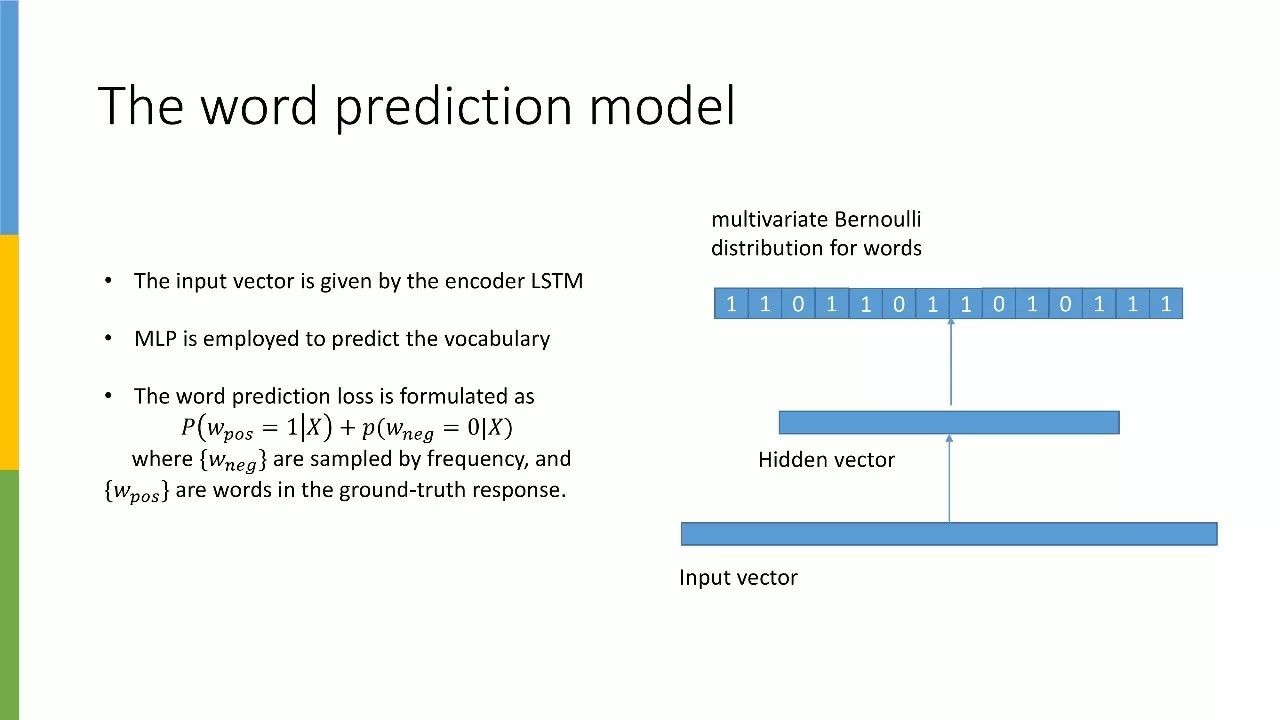 接下来我们来看如何做词预测,即如何对内容词(content words)进行预测。内容词的 input vector 是 encoder 生成的 vector。有了 vector 后,我们需要过一个回归模型(MLP),继而预测需要用到哪些词。这个预测的损失就是将最后出现在回复里的词作为正例(标签为 1),再随机采样一些负例作为 0 标签的词,从而进行预测。