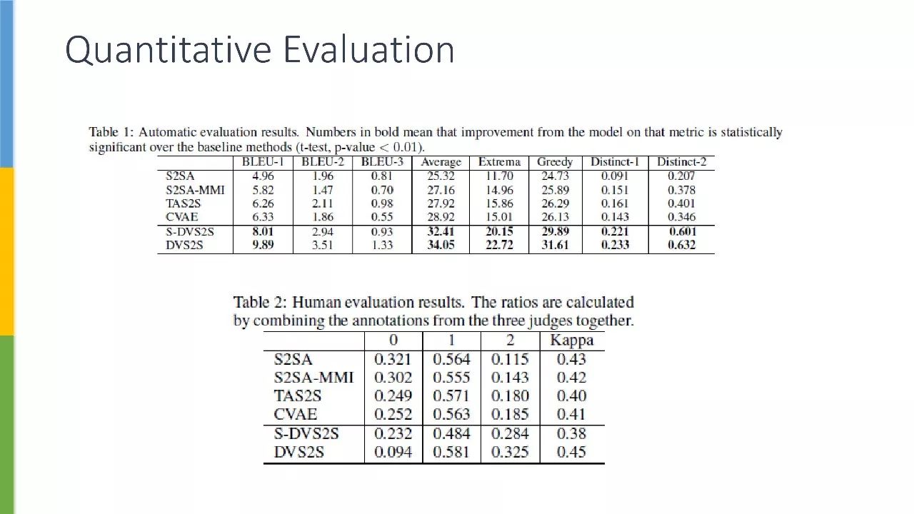 表 1 中的前四行是 baseline,DVS2S 是将词预测和 Seq2Seq 的损失串在一起计算,S-DVS2S 则是对这两个 loss 分别进行计算。从结果可以看出,DVS2S 的效果均优于其他方法。
