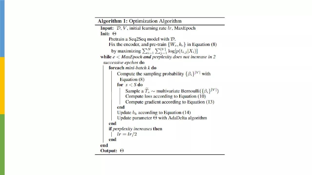 这样一来,我们就可以把词典构建和回复生成这两个损失串在一起,相当于放入一同一个公式里表示,而不是将词典和生成分开单独训练。利用逐次采样得出的结果,来评估动态词典在不同情况下,其相对应的回复生成的损失是什么。