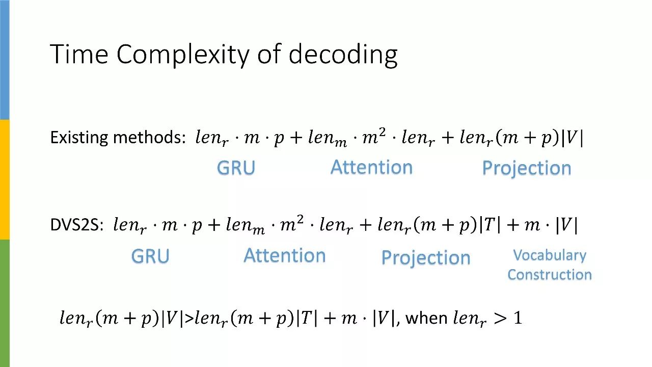 首先将 Seq2Seq 和本文的 decoding 方法进行对比,可以发现二者在 GRU 和 Attention 上花费的时间完全一致,但是本文方法在 Projection 上花的时间会少很多。