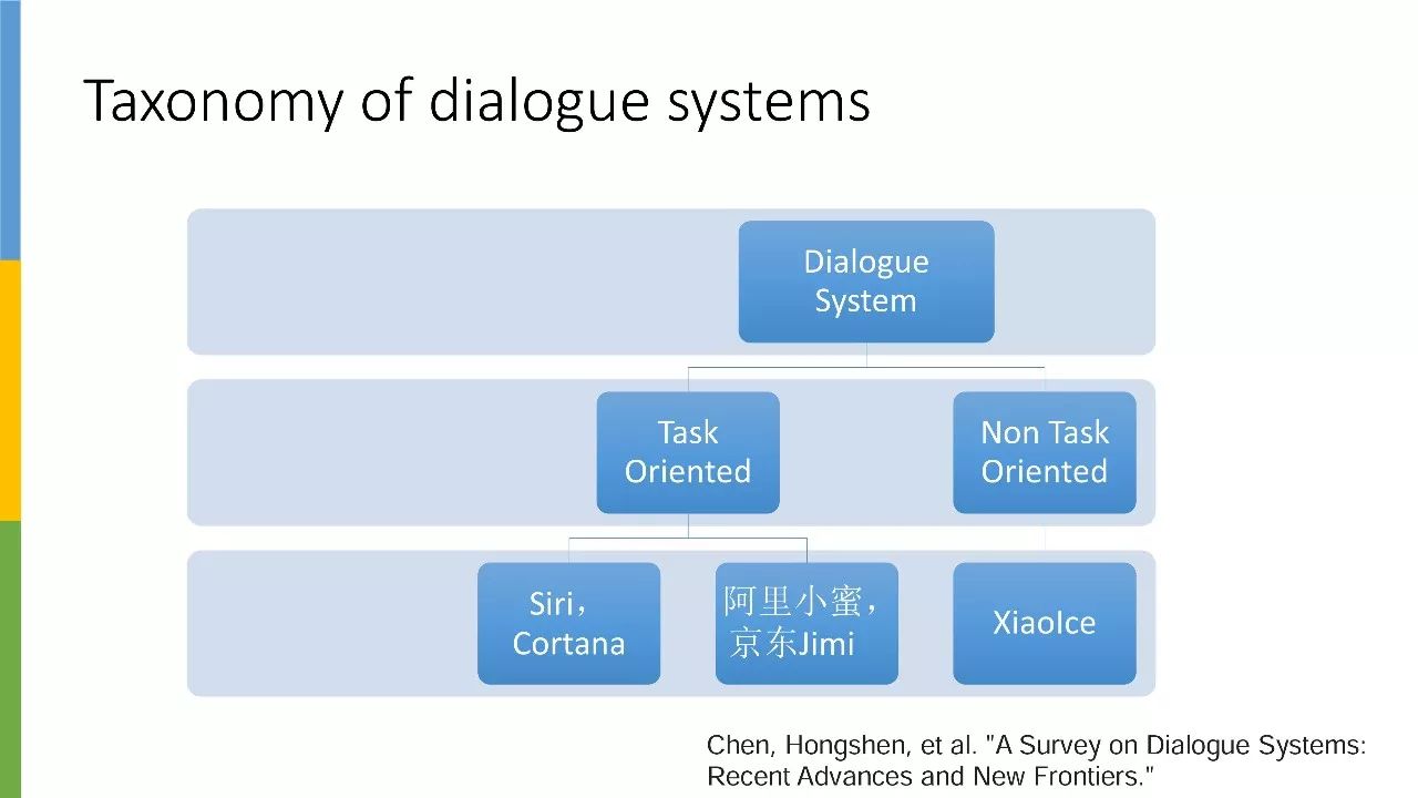 对话系统主要分为两类,一类是任务型,另一类是非任务型。任务型对话系统主要应用于企业客服、订票、天气查询等场景,非任务型驱动对话系统则是指以微软小冰为代表的聊天机器人形式。