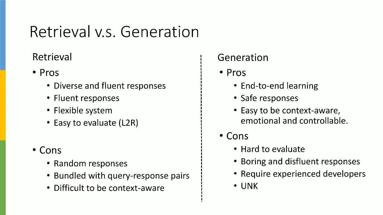 很多人认为 safe responses 是生成式聊天机器人的一个缺点,但其实从某种角度上来说,这也是它的一个优点。相比检索型聊天机器人,它生成的回复质量较为稳定。