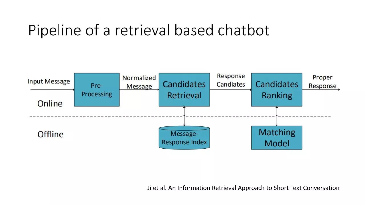 检索型聊天机器人首先需要构建一些文本和回复的 pairs,然后再训练匹配模型,上线之后先做检索再做匹配。相似度算法有很多种选择,现在一般都采用深度学习,如果是做系统的话,肯定需要融合很多相似度的特征。