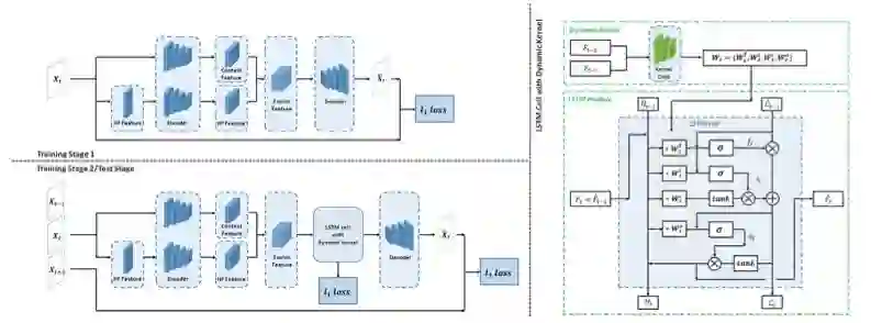 论文提出的视频预测模型图示。该架构使用论文提出的多频带分析和时变卷积核技术,能够更大限度的利用输入信息和更灵活的应对视频内容的动态变化,使得更精确地预测像素级的视频内容成为可能。