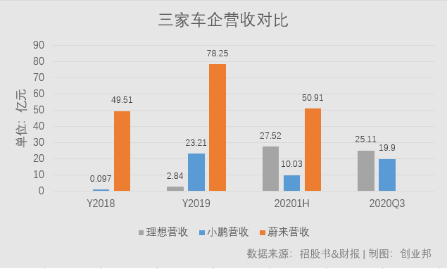 根据三家车企公布的2018年、2019年、2020年上半年业绩,以及最新的Q3财报数据显示:蔚来汽车,近三年来营业收入均排在首位,且远高于理想汽车和小鹏汽车。