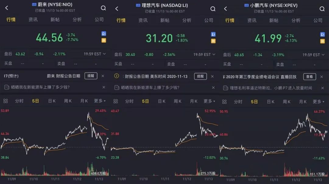 13日美股,蔚来收跌近8%,盘后继续再跌超2%,小鹏汽车收跌6.13%,盘后下挫3.19%,理想汽车收跌1.83%,盘后下挫2.56%。