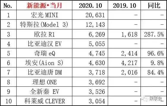 根据乘联会公布的10月新能源汽车销量排行,新造车企业的产品中,仅理想ONE一款车型入榜,位列第8。
